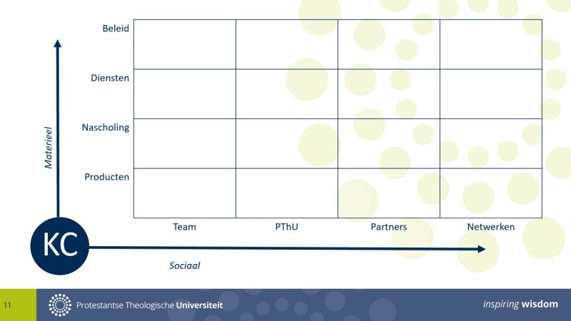 A Knowledge Centre is a thing with a social dimension. We are, first of all, a team of four colleagues. As a team, we are tasked with advancing the impact agenda of our (small) university. We therefore work with researchers, lecturers, the board, and various project groups. As a university, we also collaborate with many partners, such as other theological universities, churches, professional bodies, and publishers. Finally, there is a wider network that extends well beyond the university.